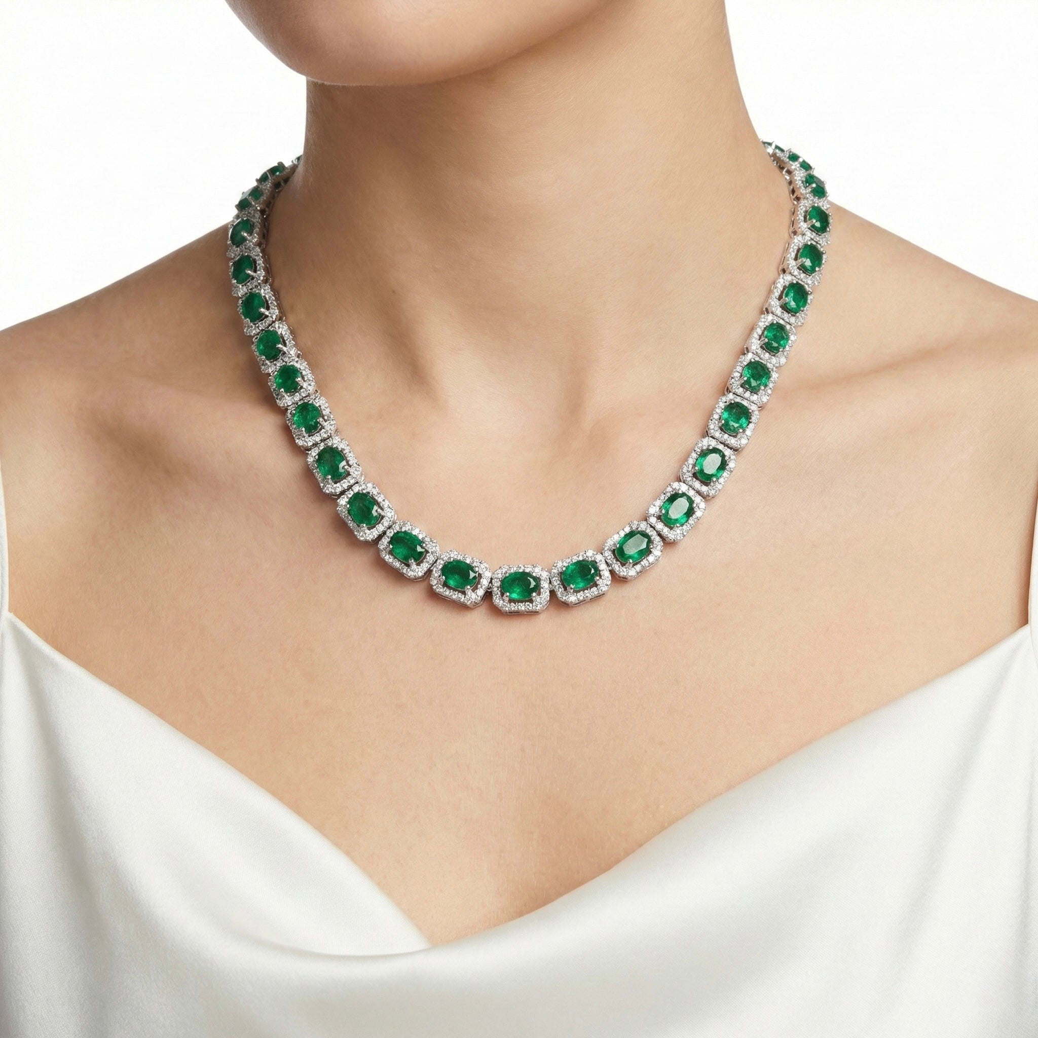 Luxurious 18K white gold necklace featuring emeralds and diamonds. Perfect for special occasions or gifting. Elevate your style with a timeless masterpiece.
